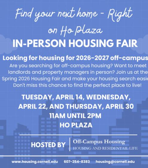 Looking for housing options in Ithaca for the upcoming year? Join us at the Off-Campus Housing 2026-2027 Housing Fair, where you can connect directly with local property managers, landlords, and service providers. Discover available apartments, house...