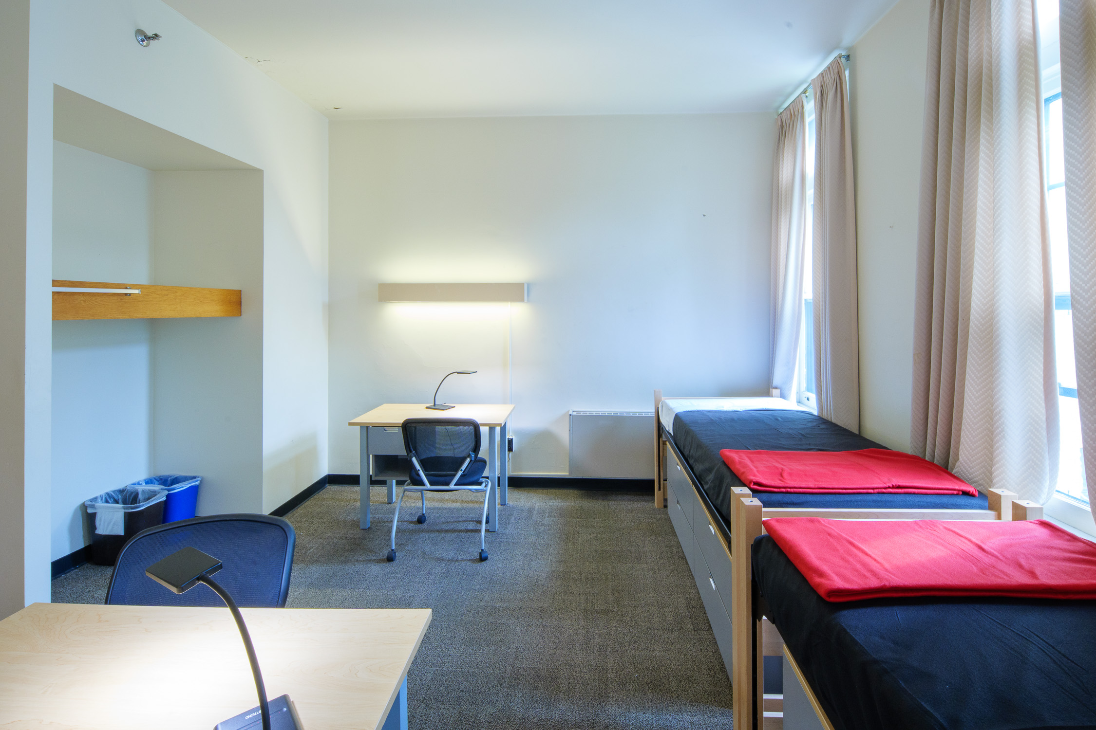 - Bedrooms contain, for each occupant: an extra-long twin bed, a closet and a bureau (or wardrobe/bureau combination), a desk and desk chair, a wastebasket, and floor carpeting