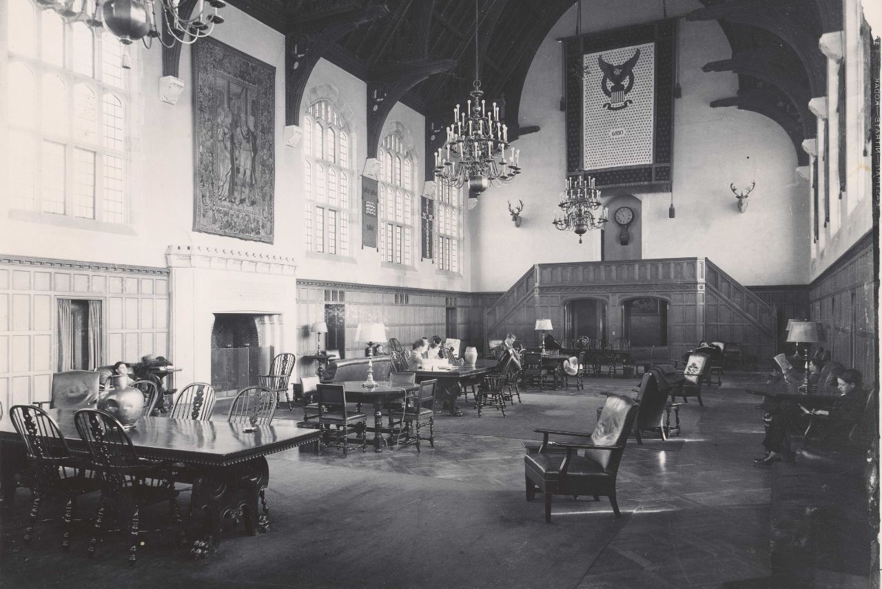 Did you know that the south side of the building was home to Willard Straight Hall’s women’s lounges, while the Memorial Room to the north served as the men’s lounge? The fourth floor restrooms still reflect this separation. In 1935, the building’s dining rooms were all opened to both men and women, and the lounges were integrated in 1943. During the initial planning for the building, some faculty suggested it be used by men only, but Willard Straight’s widow, philanthropist and social activist Dorothy Whitney Straight, advocated for women to have access.