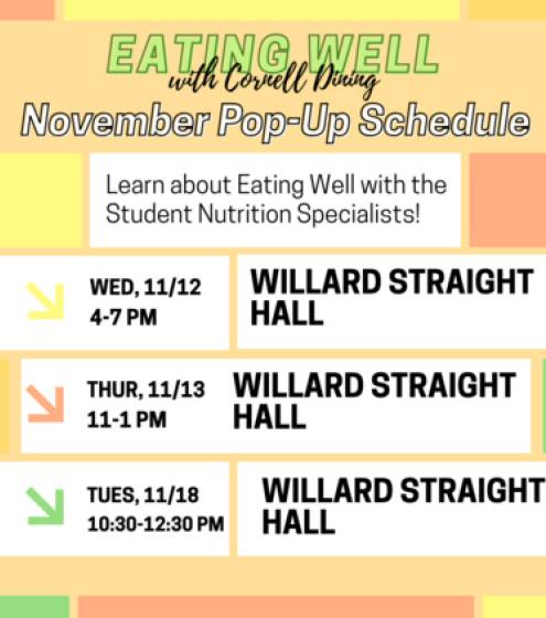 Learn about Eating Well with Cornell Dining's Student Nutrition Specialists! We're tabling in the lobby of Willard Straight Hall three times this month.