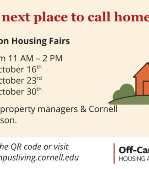 Looking for off-campus housing for next year? Stop by the IN-PERSON Housing Fair to explore rental options and connect with landlords, property managers, and Cornell resources.