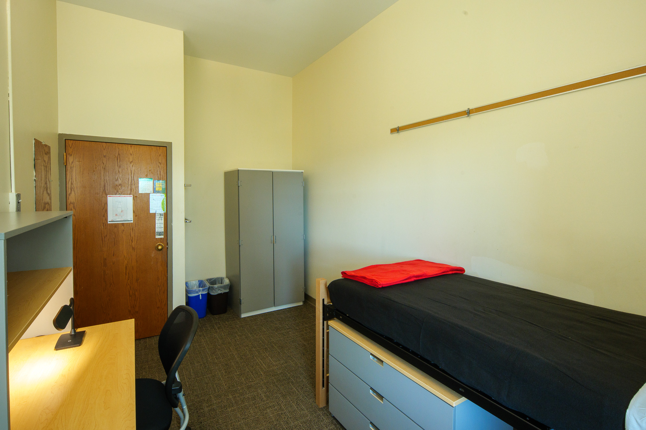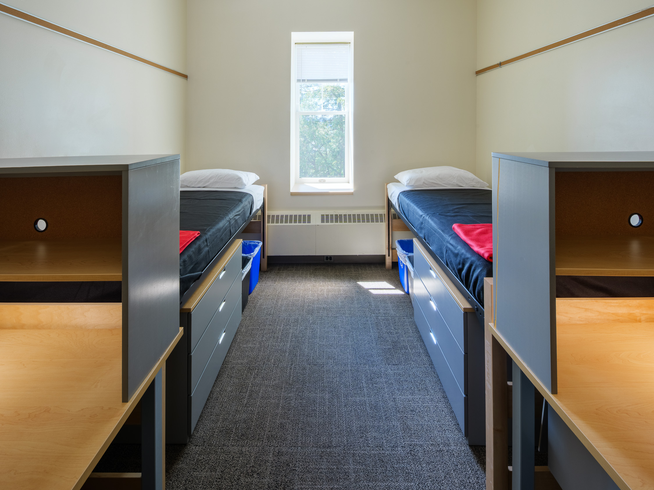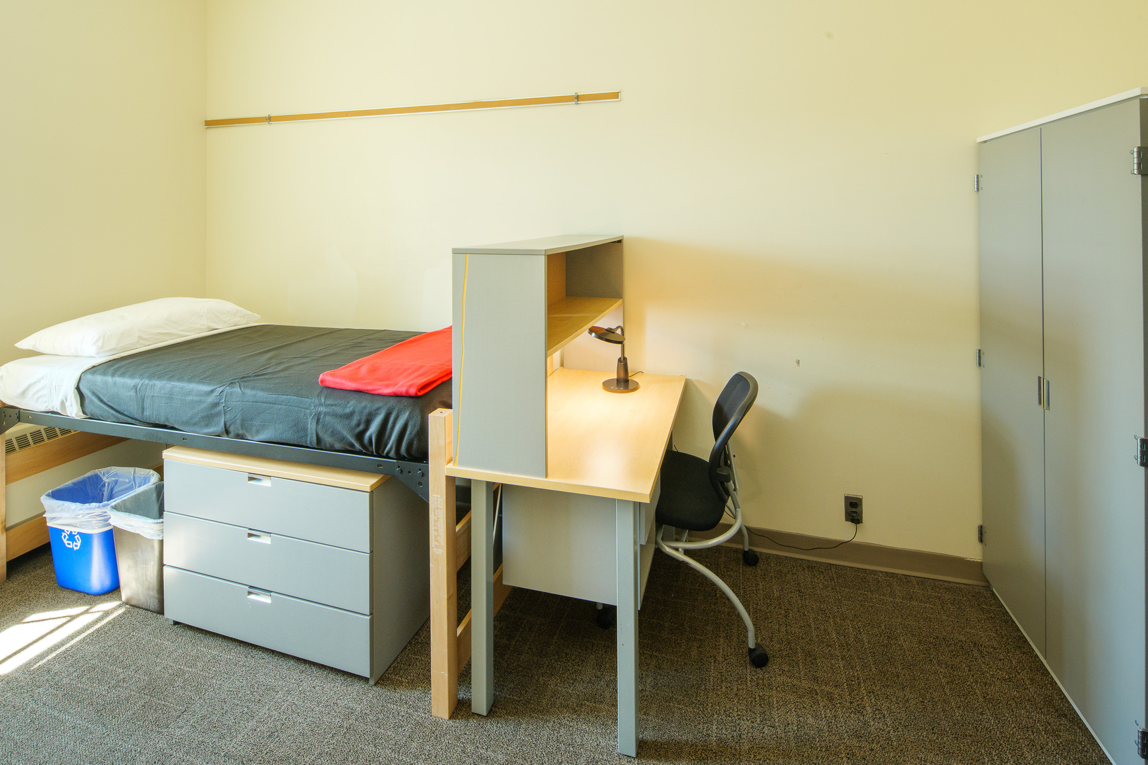 - Bedrooms contain, for each occupant: an extra-long twin bed, a closet and a bureau (or wardrobe/bureau combination), a desk and desk chair, a wastebasket, and floor carpeting