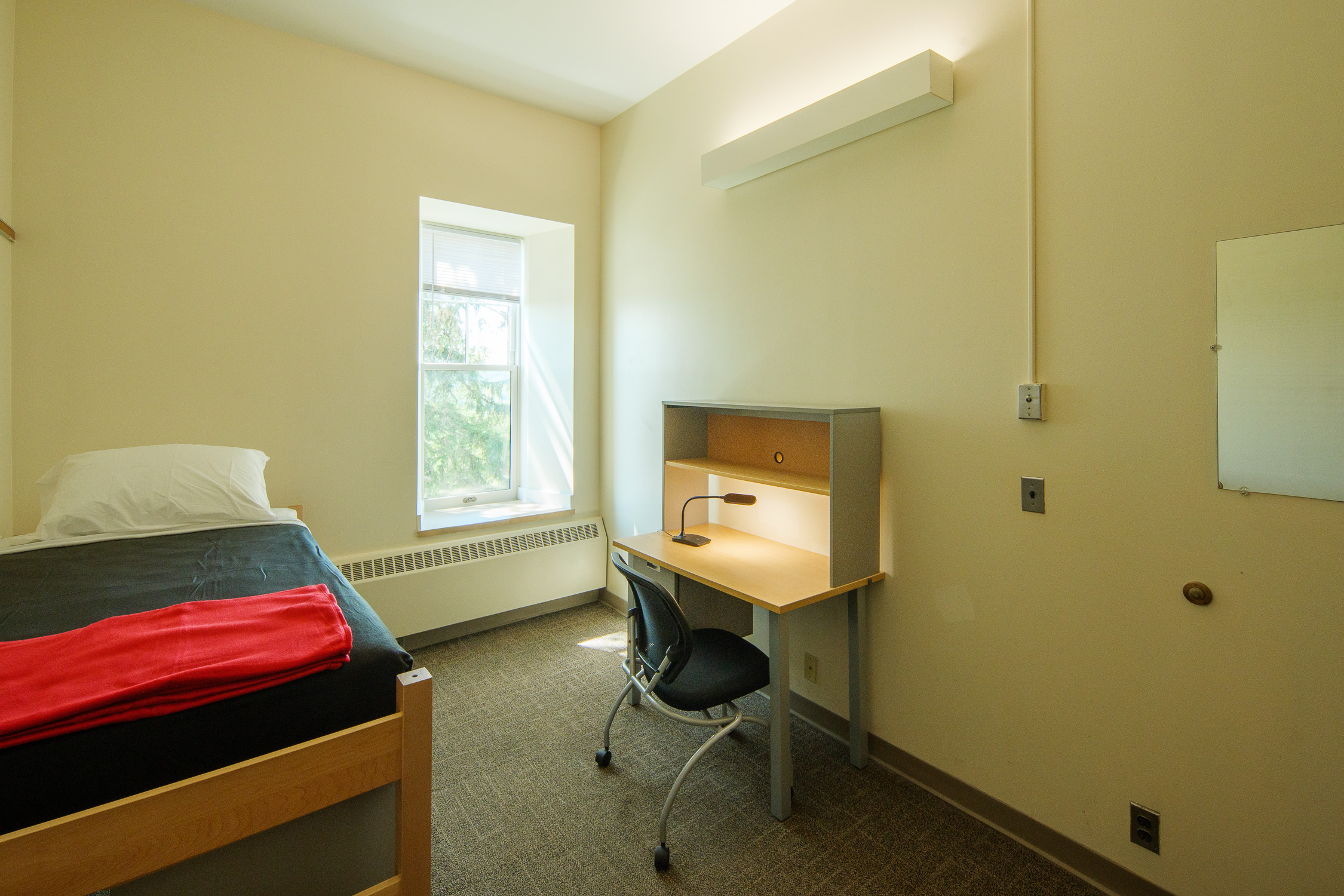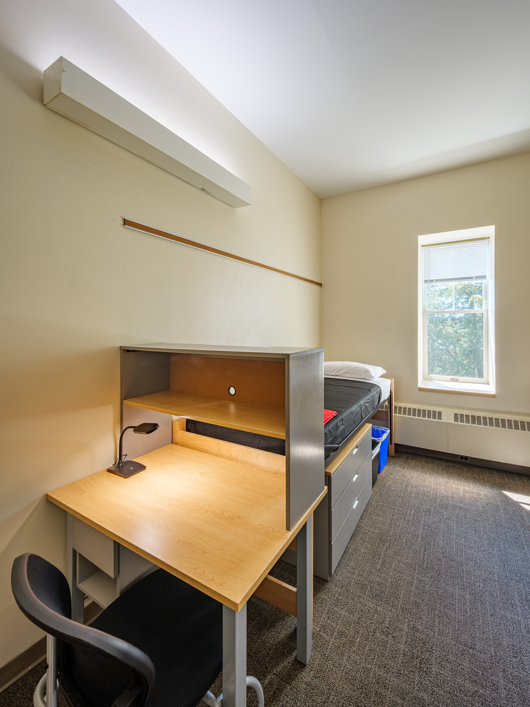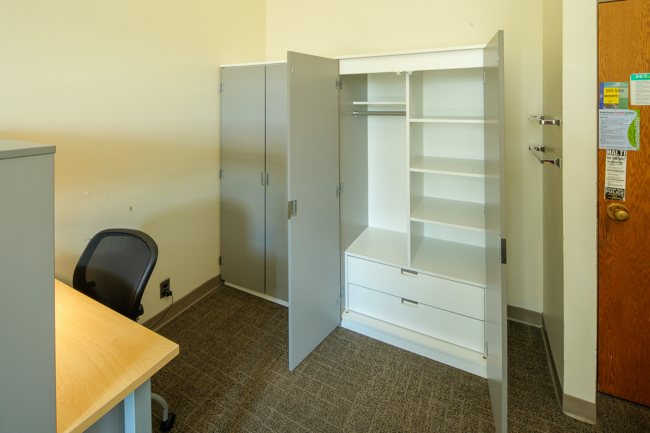 - Bedrooms contain, for each occupant: an extra-long twin bed, a closet and a bureau (or wardrobe/bureau combination), a desk and desk chair, a wastebasket, and floor carpeting