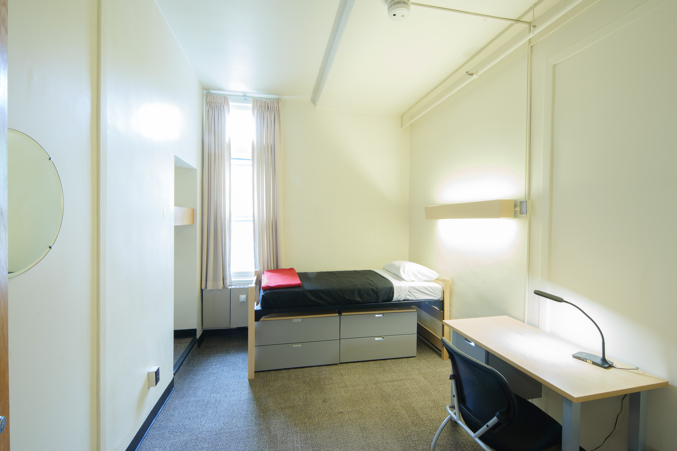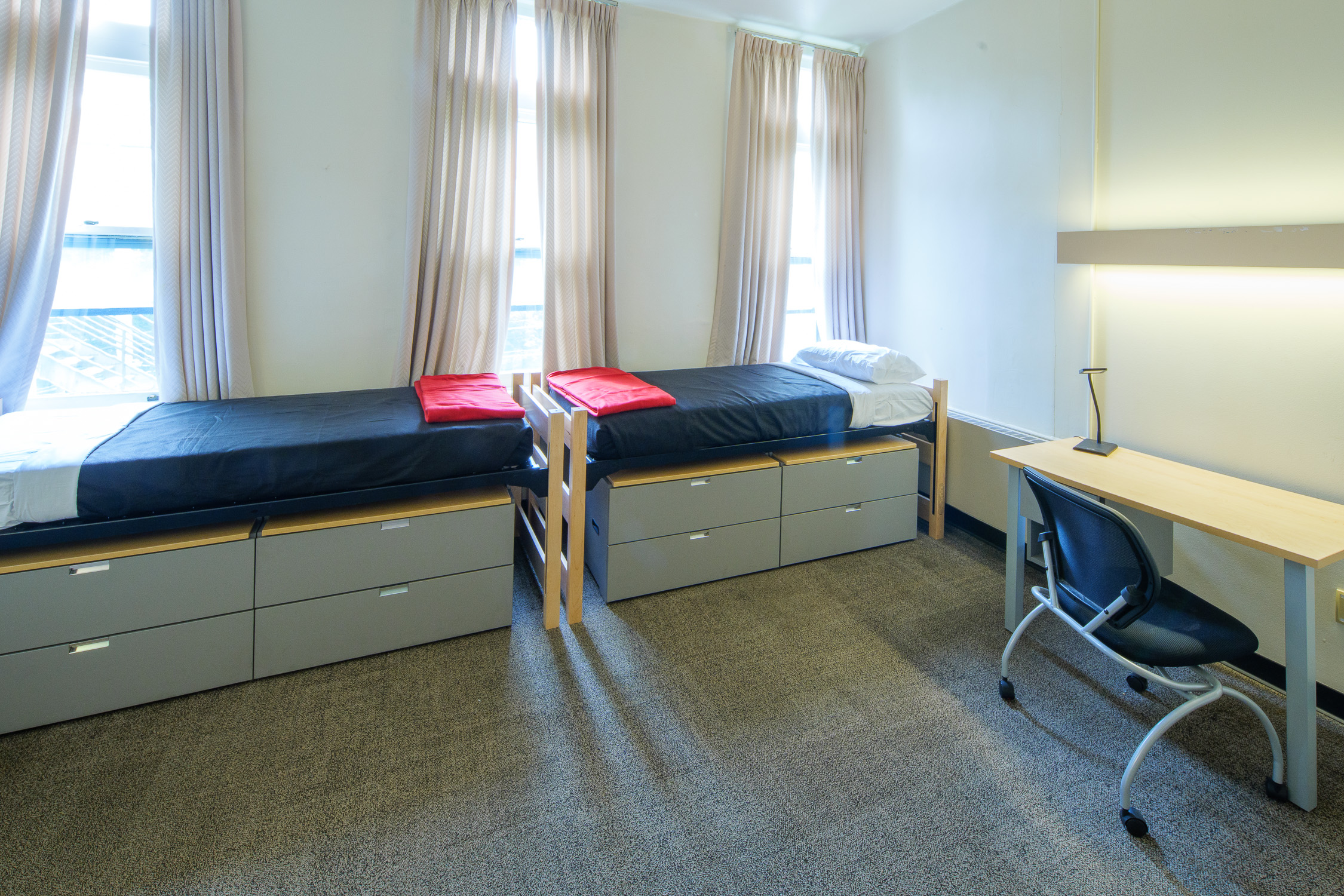 - Bedrooms contain, for each occupant: an extra-long twin bed, a closet and a bureau (or wardrobe/bureau combination), a desk and desk chair, a wastebasket, and floor carpeting